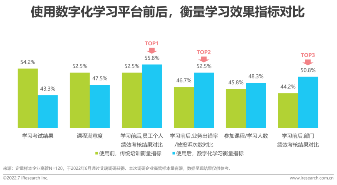 在拥有更多运营手段的同时,企业也拥有了更多将学习效果与业绩表现相关联的机会。在使用数字化学习平台前,学习考试结果、课程满意度及员工个人绩效结果是较多调研企业用以衡量学习效果的指标;在使用数字化学习平台后,更多调研企业使用员工个人绩效考核结果、业务出错率及部门绩效考核结果等指标考核员工。艾瑞认为,这可能与数字化学习与业务之间的关系更加紧密有关,根据前文调研结果显示,数字化学习平台正在与企业的各个业务系统打通,学习数据与业务数据之间的互相关联有助于企业更好的评估学习与绩效之间的关系;另一方面,这可能与数字化学习相比传统培训在提升学员业绩表现方面更有效有关(见下页)。
