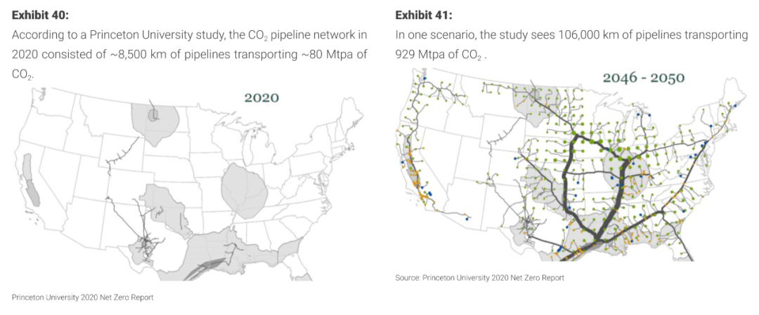 美国2020年的CO2运输管道现状,与2046-2050年干支线规划;数据来源:Princeton University2020 Net Zero Report,Morgan Stanley
