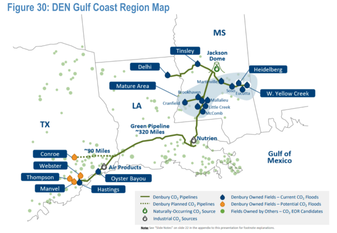 DEN丹伯里资源公司二氧化碳海湾沿岸管道地图;数据来源:J.P.Morgan