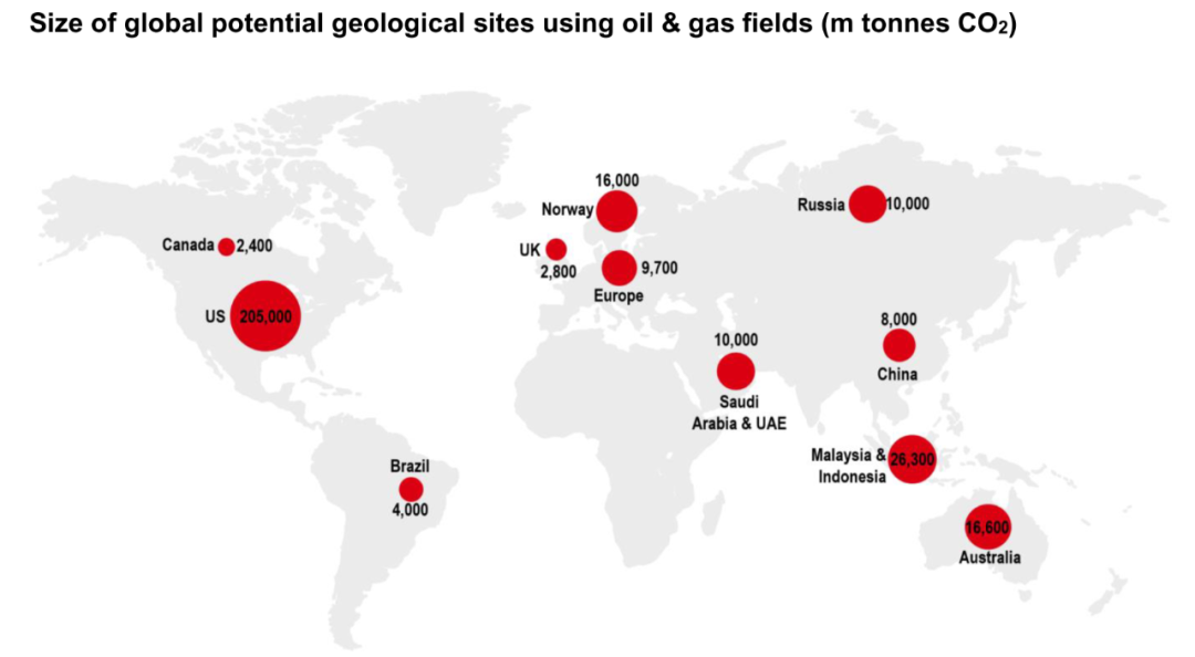 可用于封存CO2的潜在油气田规模(单位:m tonnes CO2);数据来源:Global CCS Institute,Morgan Stanley