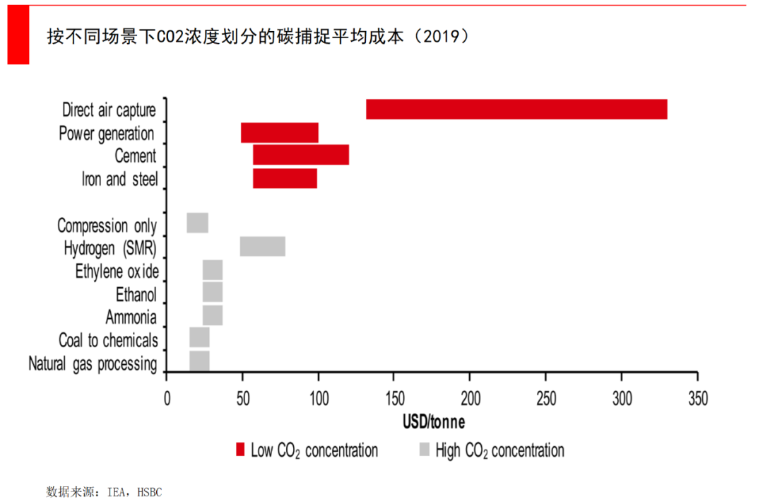 在比较容易捕捉的工业场景中,比如气体处理、化学品、氨等等,捕捉成本可以在每吨CO2 20-40美元的范围内解决,而低浓度来源(比如钢铁、水泥、发电)的捕捉成本,往往会超过每吨CO2 60美元,在特殊情况下甚至会超过100美元。