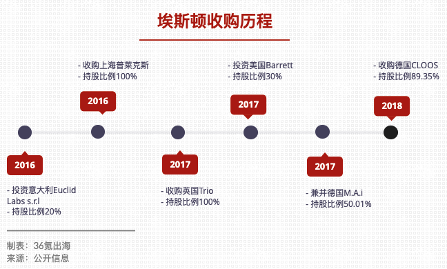 埃斯顿是国产工业机器人“四小龙”之一,自2016年开始,埃斯顿先后收购或参股多家欧美工业机器人上下游企业,包括意大利 Euclid Labs、英国 Trio、德国 CLOOS、M.A.i.公司、美国 Barrett 等。
