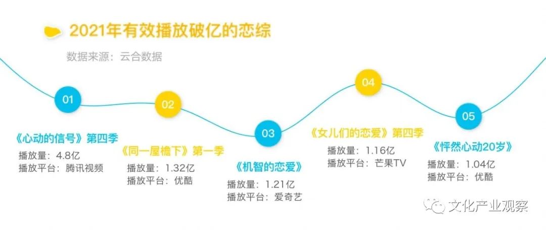 2021年,全网14档恋综中有5档播放量过亿。其中,《心动的信号》第四季凭借超4亿的有效播放量依然遥遥领先,被称作“恋综天花板”。
