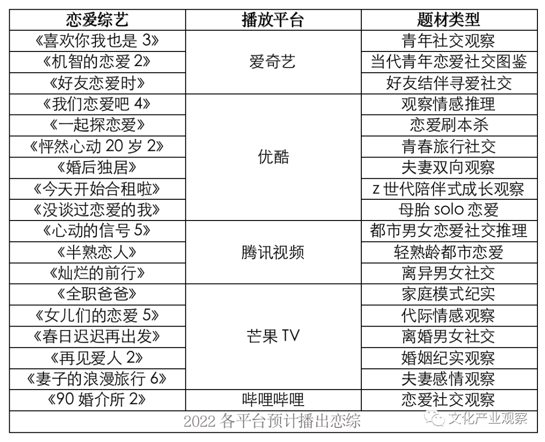 今年,这条“看别人谈恋爱”的恋综赛道尤为拥挤,2022年预计爱优腾芒将共计释放18部恋综。同时,更贴近年轻群体的短视频平台bilibili也不甘落后,《90婚介所》是其出品的首档异性交友节目,前文中提到的热搜话题,则是出自于此。