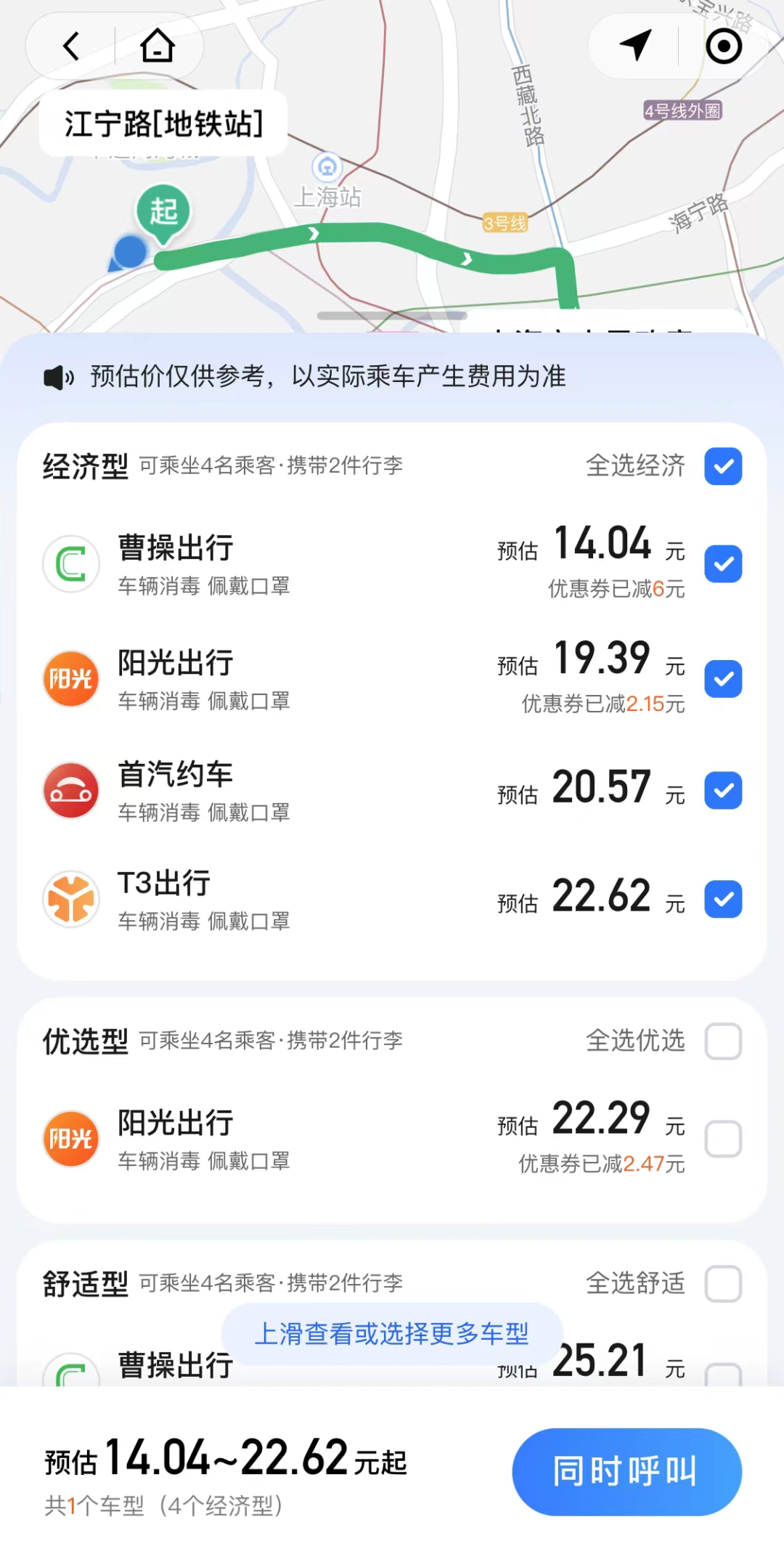 即使一开始以高端“红旗”车型起家的“国家队”T3出行,现在也加入了特享、快享、速享等更加接地气的车型,而且这些经济型车型还可以使用优惠券。一单14元基础价的路程,少则便宜一两元,多则便宜四五元。