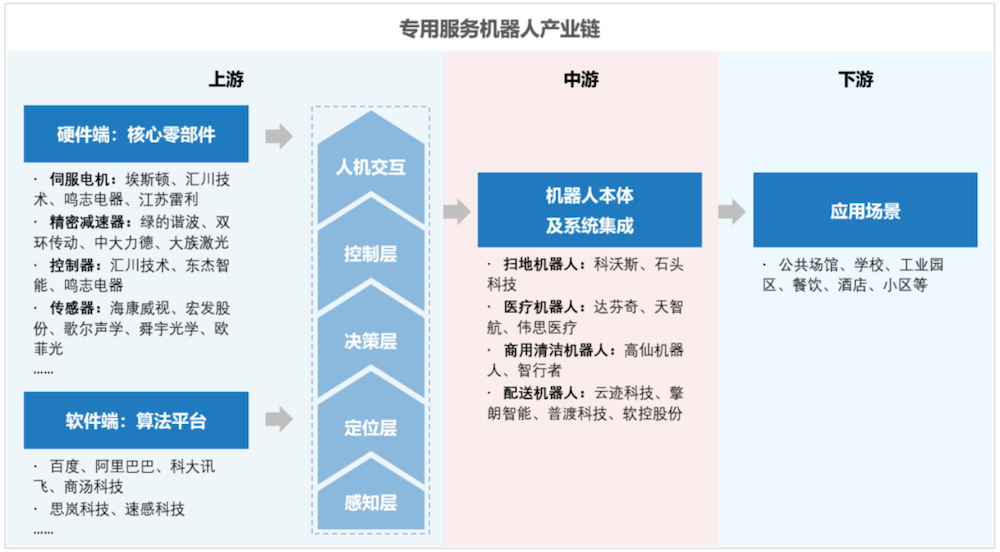 技术层面,工业机器人与服务机器人结构有较大差异。其中,工业机器人主要以控制器、伺服电机、减速器等硬件为核心零部件,而专用服务机器人除上游核心零部件以外,其关键技术难点在于软件端,主要采用“多传感器融合+深度学习”架构,集算法、应用层、后台、数据四大能力于一体,当中算法能力是核心焦点,具体涉及多传感融合技术、SLAM技术、路径规划技术、运动控制技术、人机交互技术等。