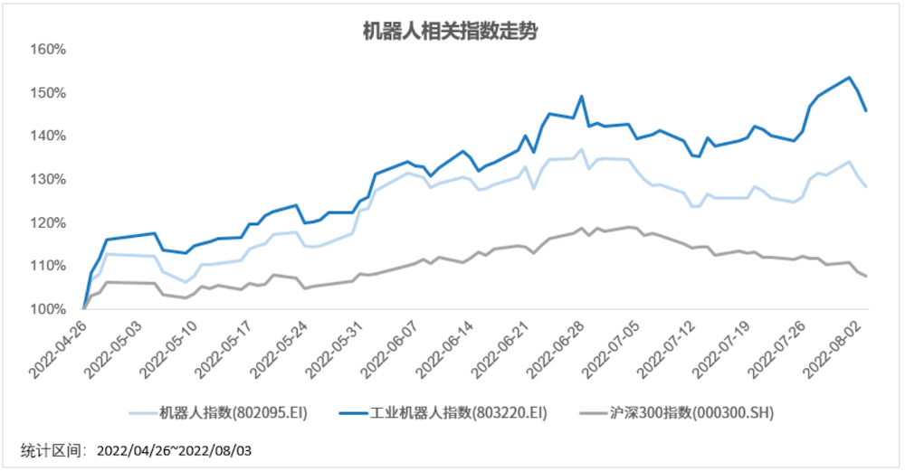 整体来看,二级市场机器人相关企业多属于工业机器人领域。以2022年4月26日为基期,自年内低点以来,机器人指数(802095.EI)和工业机器人指数(803220.EI)分别累计上涨28.22%和45.82%,跑赢沪深300指数20.75和38.34个百分点。