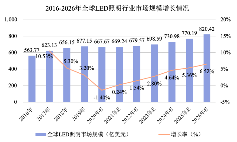值得注意的是,民爆光电所处的LED照明市场容量较为可观。咨询机构“Frost&Sullivan”数据显示,2016-2019年,全球LED照明市场以年均复合增长率6.3%增长,市场规模从563.77亿美元增长至677.15亿美元。虽然受新冠肺炎疫情影响,2020年市场规模有所下滑,但随着疫情的逐步控制,预计未来LED照明市场将以3.49%的速度增长,从2020年的667.67亿美元增长至2026年的820.42亿美元。