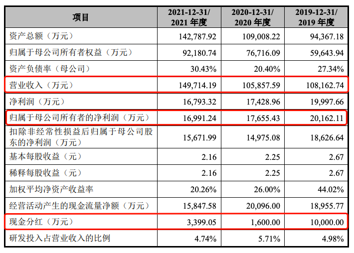 最近几年,民爆光电净利润逐年下滑却不忘分红。《招股书》显示,2019-2021年,民爆光电的营业收入分别为10.82亿元、10.59亿元、14.97亿元;归属于母公司所有者的净利润分别约为2.02亿元、1.77亿元、1.7亿元。