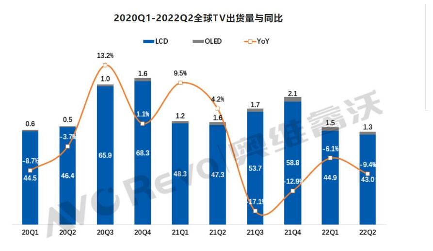 据行业数据机构奥维睿沃(AVC Revo)《全球TV品牌出货月度数据报告》显示,2022年上半年全球TV出货量90.7M(M=百万台),同比下降7.8%;出货面积63.7M㎡,同比下降5.4%;出货平均尺寸48.5”,较去年同期增长0.5”。