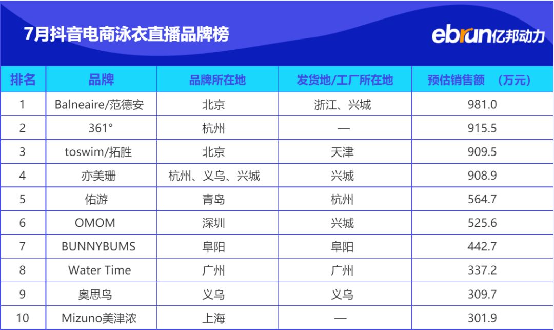 比基尼广场是兴城著名景点,一个红色比基尼造型的海边广场。盛夏夜晚,不少泳装主播会在这里直播带货。亿邦动力调查发现,今年6-7月,抖音电商泳衣直播品牌榜TOP10,有2家注册在兴城,4家从兴城发货,即Balneaire范德安、亦美珊、fouqi否奇、OMOM。