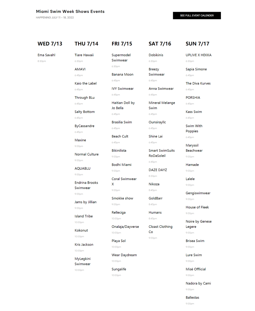 美国迈阿密泳装周2022年走秀名单,该泳装展是全球泳装趋势的晴雨表,出场品牌是兴城泳装设计的重要参考对象。