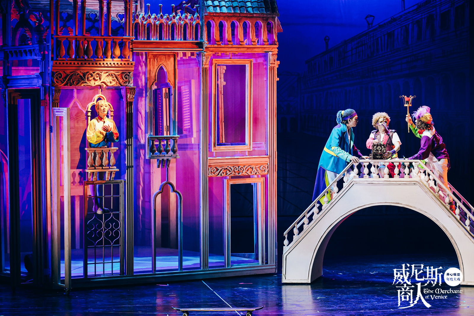 界面文娱在7月31日的预演现场看到,陈薪伊和开心麻花创排的《威尼斯商人》中,舞美、服装和配乐都做了大幅的改造。演员们踩着滑板登台,灵活走位,舞台上的“魔术匣子”随着剧情和人物情绪而变换,决定鲍西娅命运的金、银、铅三个匣子从舞台上方滑下,悬置于主角们面前。在现代化的灯光、音乐下,水城威尼斯发生的一切,都变得流动了起来。