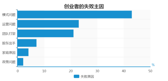 模式问题,占43%。各种主打市梦率的创业公司,在新经济的大旗下,尝试各种颠覆一切的新模式,从电商到移动互联网,从O2O到企业端服务。但是随着市场风云变幻,概念或模式往往会迅速由香转臭。随着泡沫的破灭,这些企业会迅速因为融不到钱而倒闭或泯然于人群之中。