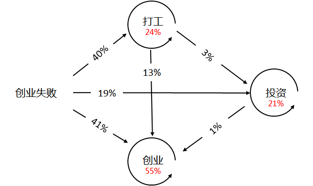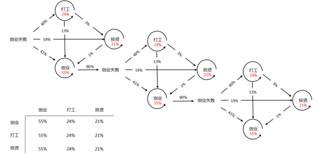 如果连续动态得观测这些创业者的变化,结果如下图,这是一个马可夫链的问题。为了不掉粉,就不列出来转换矩阵以及更改下图的数字了。