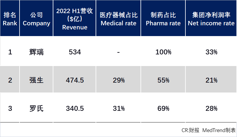 按全球药械企业统计,排名TOP 3依次是:辉瑞、强生、罗氏。