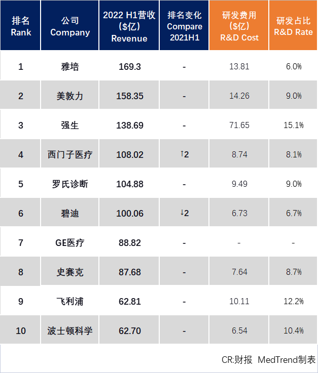 上个排名年度,受疫情催化,医疗器械全球TOP企业排名大洗牌,随着红利散尽,同时罕有重大并购,因此今年医疗器械座次开始企稳。