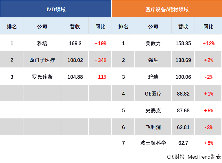 受IVD业务驱动的公司如雅培、西门子医疗、罗氏诊断,增速均达两位数。
