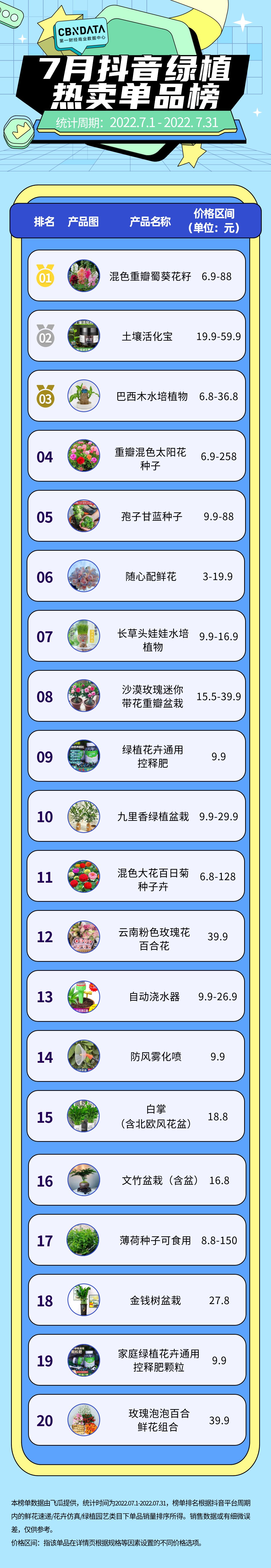 高性价比成了抖音绿植热销的绝对优势,绿植赛道在7月的平均客单价为20.07元,50元以下的商品占了整体销售额70%以上。有人追求好看、平价、好养活,也有人偏爱小众、贵价和需要花费心力的品种。为了呈现出绿植赛道的消费趋势,我们根据飞瓜数据整理了7月期间抖音绿植园艺赛道的整体销售情况,按销量从高到低的TOP20单品如下: