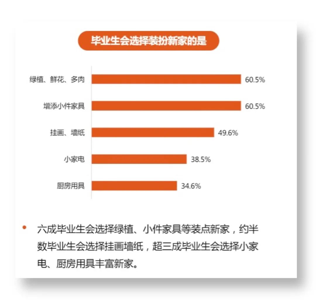 疫情之后,愈发加剧的心理负担和生活压力,让人们不得不多方寻找情绪的释放口。在这个时间点,品种多样、价廉物美的绿植走红,无疑契合了他们的需求。比起用大宗消费释放情绪,养一株植物显然性价比更高。58安居客房产研究院《2021年毕业生调研报告》显示,准备搬入新居的年轻人里,60.5%都会选择用“绿植、鲜花、多肉”装扮新家,超过了选择购买挂画墙纸、小家电的比例。