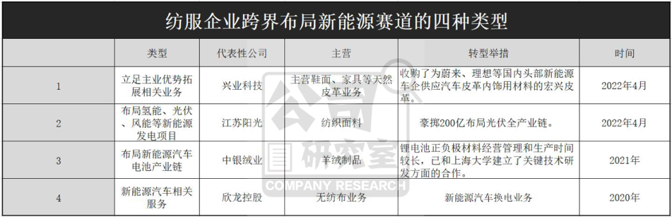 02 竞相跨界新能源,服装类上市公司4类转型形式