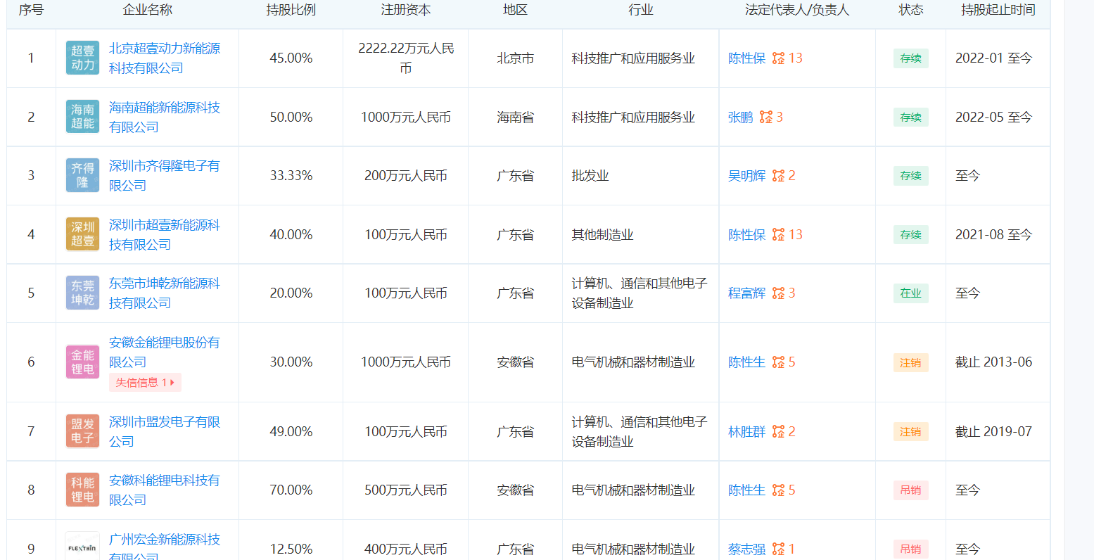资料显示,成都超壹动力在今年 2 月底成立,经营范围包括电池製造;电池销售;工程和技术研究和试验发展等。这家公司有三大股东,分别为北京超壹动力新能源科技有限公司、宁波兆坤佳泰商务信息咨询有限公司和四川大唐能源投资有限公司,分别持股 40%、40% 及 20%。而北京超壹动力成立于2022年1月底,股权穿透后,显示这家公司的实控人乃陈性保,在深圳、东莞、安徽等地投资设立了与锂电有关的新能源公司。另一家并列大股东宁波兆坤佳泰像是一家股权投资公司,成立于2019年3月。小股东四川大唐能源成立于2006年,从事钒钛磁铁矿冶炼,是小伙伴中离锂电最近的。