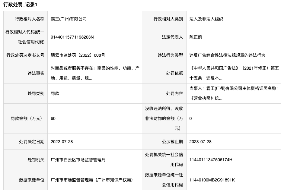 信用中国(广东)网站显示,7月28日,霸王(广州)有限公司因发布虚假广告,被广州市市场监督管理局罚款60万元。处罚事由显示,当事人在微信小程序上销售的本草堂红润焕采滢亮礼盒和红润焕采洁面乳并未取得国产特殊用途化妆品行政许可批件,属于普通化妆品,不具有其所宣称的“亮肤白皙”“改善暗黄” 等功能。当事人销售的霸王抑菌洗手液和丽涛除菌去渍2合1洗衣液检测报告并没有杀菌方面的检测项目,不具有其所宣称的“有效杀菌99%”等功能。