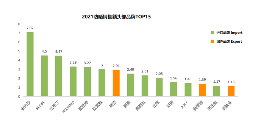 从2021年防晒销售额头部品牌排名来看,防晒市场份额主要呈现以国外品牌“吃肉”,国产品牌“喝汤”的特点,且短时间这一格局无法撼动。