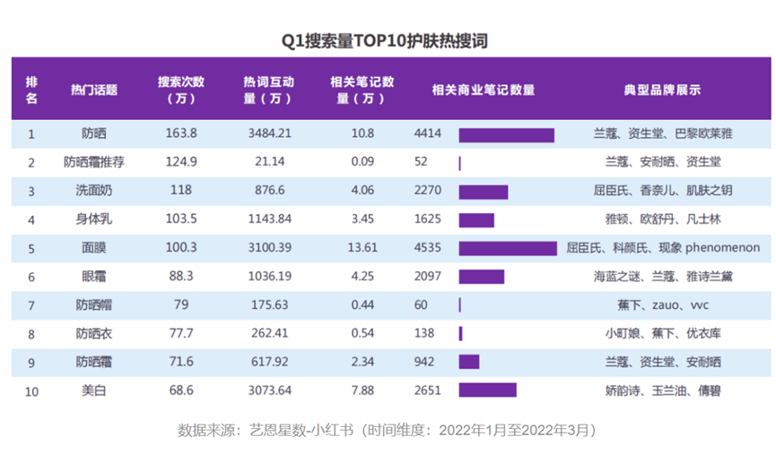 这一底气主要源于,消费者关注度及需求呈正向增长趋势。据美丽修行大数据显示,2019年到2021年,消费者对防晒品类的搜索量从577万次上升至4953万次,提升了7倍。2022年第一季度,防晒搜索量高居护肤热搜词榜首,无论是搜索量、笔记数量上均远远超过其他品类,成为消费者进行护肤进程的“必修课”,进而消费潜力的释放催生“防晒经济”不断上行。
