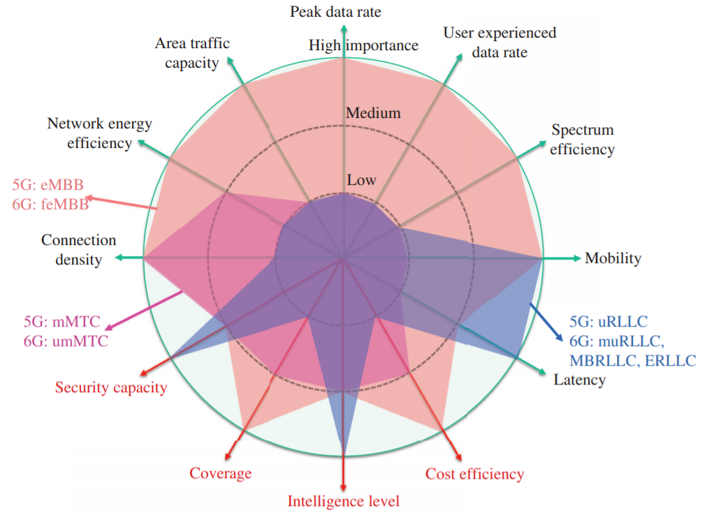 6G,即第六代移动通信标准,也被称为第六代移动通信技术。和5G相比,6G在峰值速率、时延、流量密度、连接数密度、移动性、定位能力等方面都更具优势。美国贝尔实验室提出的一些 6G网络关键性能指标显示,6G网络数据传输的峰值预计将超过100 Gbps,连接密度达到107 个设备 /km2,时延应小于0.3 毫秒,能源效率将是5G的10倍,容量将达到5G系统的10000倍。