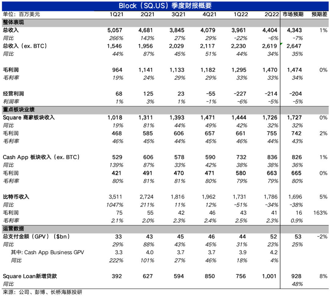 北京时间8月4日美股盘后,数字支付公司Block(SQ.US)公布了2022年二季度财报。总的来看,公司各项财务表现基本都在预期之内无功无过,缺乏吸引眼球的亮眼之处,财报详细要点如下: