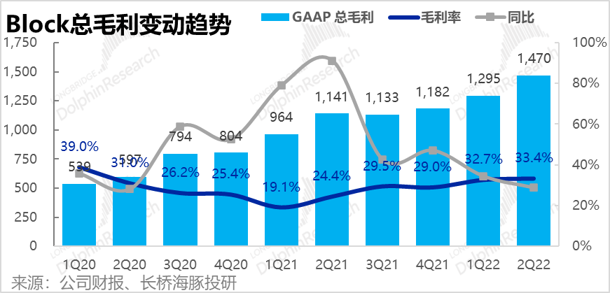 2)以联名银行卡业务和即时提现业务(至银行账户)为主的订阅和服务收入本季为6.16亿元,同比增长24%,与上季度增长28%相比并未明显放缓。今年早先时候,Block将用户即时取现的手续费率的上限由1.5%提高到1.75%,并设置了0.25元每笔的最低收费。于此同时PayPal旗下的移动钱包Venmo也将即时提现费率由1.5%提升至1.75%。