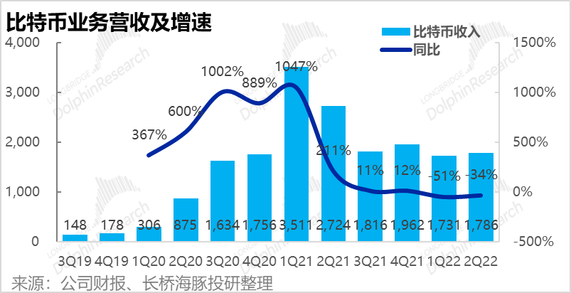 本季比特币业务收入17.86亿美元,相比上季度环比略有增长,好于市场预期的16.96亿。海豚君认为这主要是因为比特币价格在暴跌后企稳并有所反弹,加密货币的交易热度比悲观的预期更好。