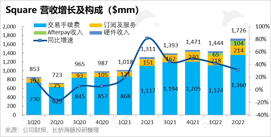 首先,公司面对商家端的Square板块本季实现总营收17.3亿美元,与市场预期基本一致。若剔除Afterpay并表后贡献的1.04亿收入,Square营收可比增速为24%,较上季35%的增速进一步放缓,但在预期之内。