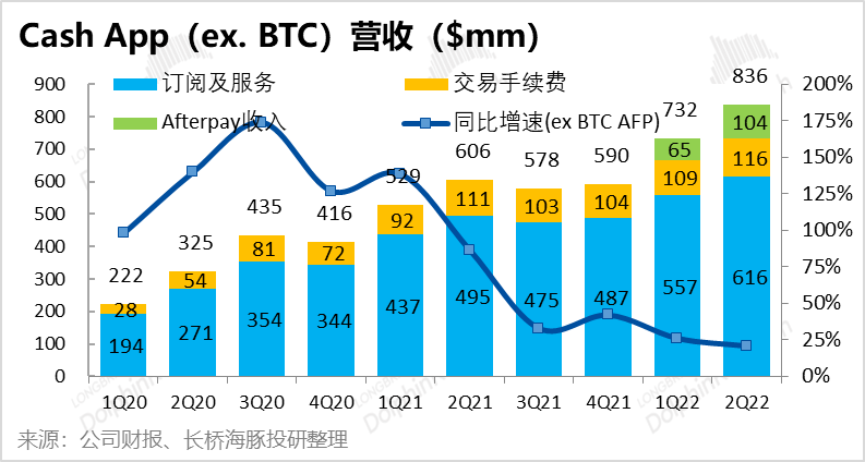 面向消费者的Cash App板块在剔除比特币交易业务后,本季实现营收8.36亿美元,略高于市场预期的8.26亿元。同样剔除Afterpay的并表影响后,营收可比增速为21%,较上季度的26%再度放缓。具体来看:
