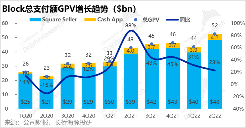 在经营数据方面,Square 商家完成的支付金额 (GPV) 为480亿,同比增长24%。加上通过Cash App完成的C2B支付额,总GPV为520亿美元,略低于市场预期的530。海豚认为不及预期的原因主要是Cash App的B2C GPV 增长明显放缓。