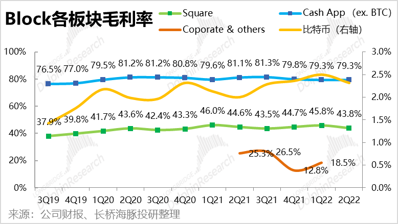2)剔除比特币业务后,Cash App板块实现毛利润6.63亿元,与市场预期一致。不过由于本季营收略超预期,因此板块毛利率实际并未如市场预期的有所改善。具体来看,本季Cash App(ex. BTC)毛利率为79.3%,与上季度一致,而市场则预期为80%。