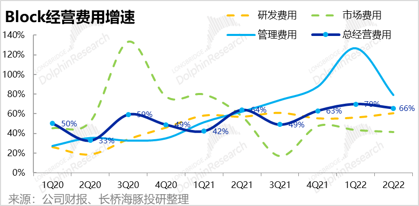 细分来看,管理费用支出绝对值较上季度减少(可能主要由股权激励费用减少);而由于公司合并Afterpay以及在其他新业务上的投入,研发费用增速反而环比由56%提高到61%。而在宏观环境转弱、公司增长放缓的背景下,营销费用增速也进一步放缓。