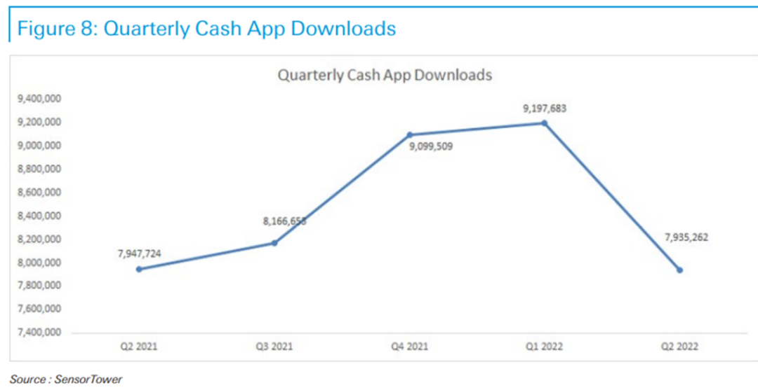 在经营数据上,虽然公司尚未披露官方月活数据,不过从第三方的调研数据也能让我们一窥Cash App的用户增长情况。据SensorTower统计,今年二季度Cash App的下载量在经历了2021年底-2022年初的暴涨后已明显回落到与去年二季度一致的水平。可见在宏观经济变差的情况下,Cash App的用户增长应当也有所放缓。