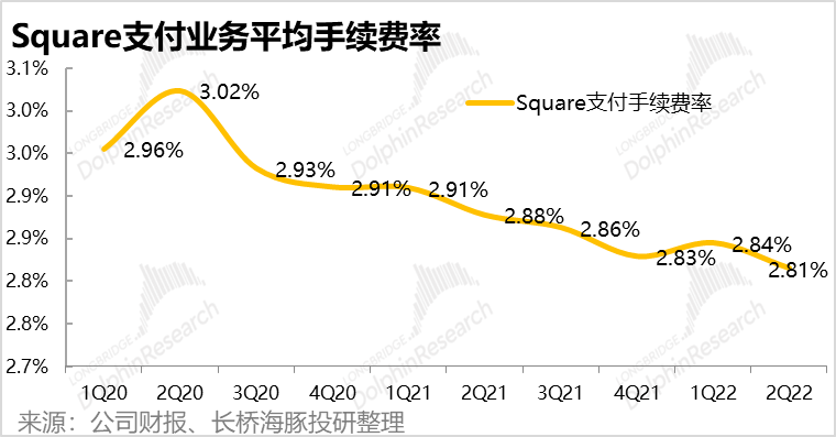 由于Square支付手续收入增速低于GPV增长,可以推断支付手续费率有所下行。经长桥海豚君推算,本季度支付业务平均手续费率继续下滑到2.81%,处于持续下行周期中。不过这也符合海豚君先前的判断:随着公司服务的中大型商家增长,支付手续费率会持续下降。