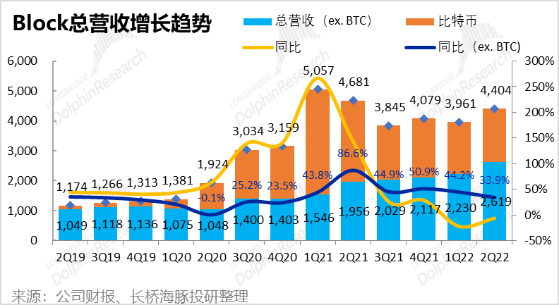 1、加总上述各项业务,本季公司总营收44亿美元,同比下降5.9%,不过略高于市场预期的43.4亿元,主要是因为比特币业务超预期的表现。剔除波动巨大的比特币业务后,公司营收26.2亿元,可比营收增速为34%,但略低于预期的26.5亿美元。