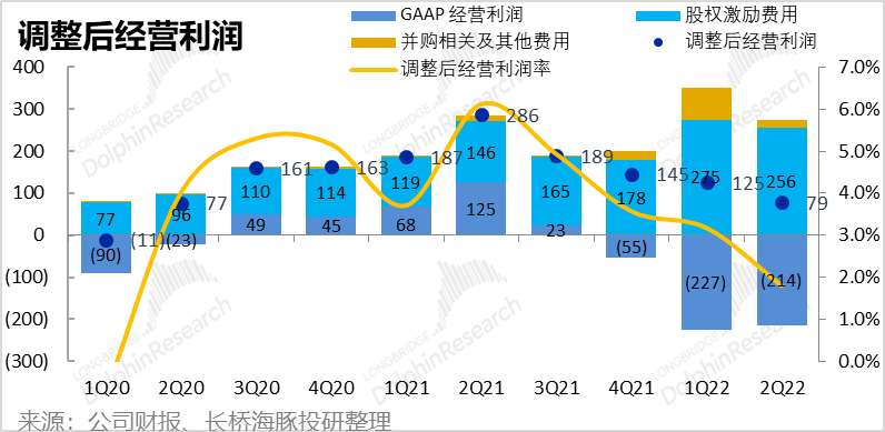 因此,在经营费用增长大幅高于营收和毛利的背景下,公司本季再此录得2.14亿美元的净亏损。而在剔除股权激励费用和其他调整项后,海豚君计算的Non-GAAP经营利润为0.79亿元,较上季度的1.25亿的进一步缩窄。