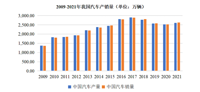 中国汽车工业协会数据显示,2020年我国汽车产、销量分别为2522.50万辆和2531.10万辆,分别同比下降1.93%和1.78%。2021年全年我国汽车产、销量分别为2608.20万辆和2627.50万辆,分别同比增长3.40%和3.81%,略有回升。