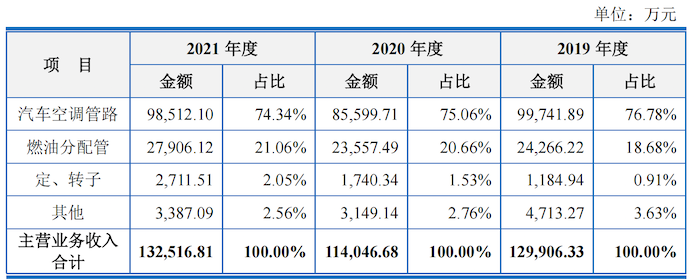 招股书显示,上海汽配的主要产品为汽车空调管路、燃油分配管的销售,并涵盖部分新能源汽车电机定、转子及其他收入。每年约75%的收入来自汽车空调管路,约20%的收入来自燃油分配管,整体产品类目较为单一。
