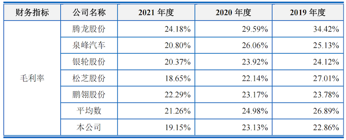 2019年至2021年,上海汽配主营业务毛利率分别为21.88%、21.64%和16.51%。招股书显示,同行业可比公司中腾龙股份与公司的产品较为接近,但腾龙股份同期毛利率分别为34.42%、29.59%和24.18%,远高于公司。原因在于腾龙股份已将业务产业链延伸至上游,通过自产铝管等原材料的方式进一步降低产品成本。