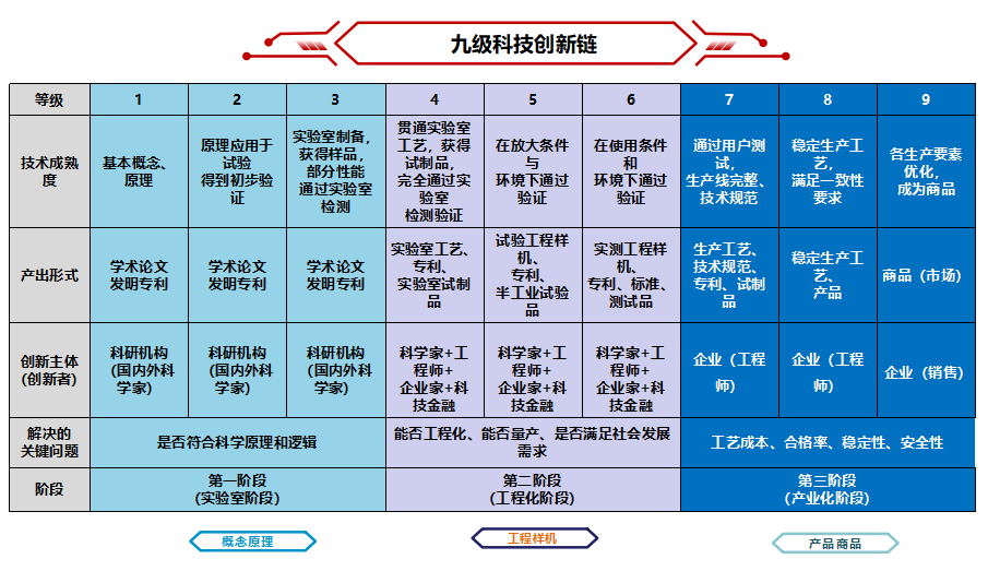 目前,国家公认的产学研流程分为九级科技创新链,其中1-3级是基础研究阶段,主要在实验室中,创新主体以科研人员为主;4-6级是工程化阶段,探索是否有量产的可能,这时工程师、企业就加入进来了;而7-9级是产业化阶段,主要由企业核算生产成本、建立技术规范、量产标准等。