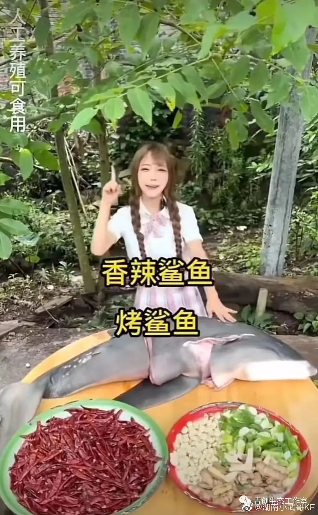 这是7月14日,拥有百万粉丝的网红美食主播“提子”发布的一条视频。很快,这条鲨鱼,就被做成了沾满辣椒面的红烧鲨鱼。视频左上方,打着一行字“人工养殖可食用”。提子抱着鲨鱼尾巴,咬下一块肉,对着镜头比了个“耶”,嘴巴沾了一圈酱料,笑容灿烂。