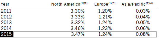 到2015年截止,RCL有54%的客源来自北美洲,2011年以来,该地区的游客增长平均每年为2%。