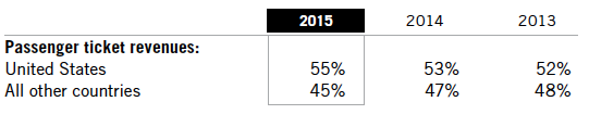 2015年,有55%的船票收入来自于美国,比2014年提高2%