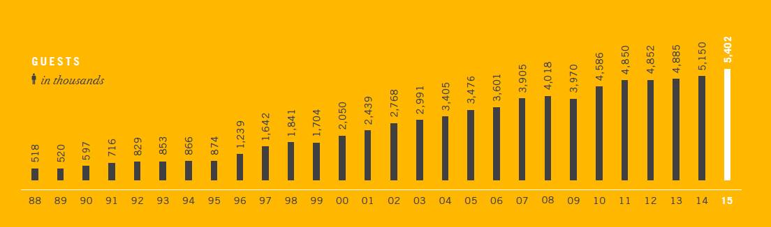2015年,有45%的船票收入来自于其他地区,比2014年减少2%(欧洲销售下降)